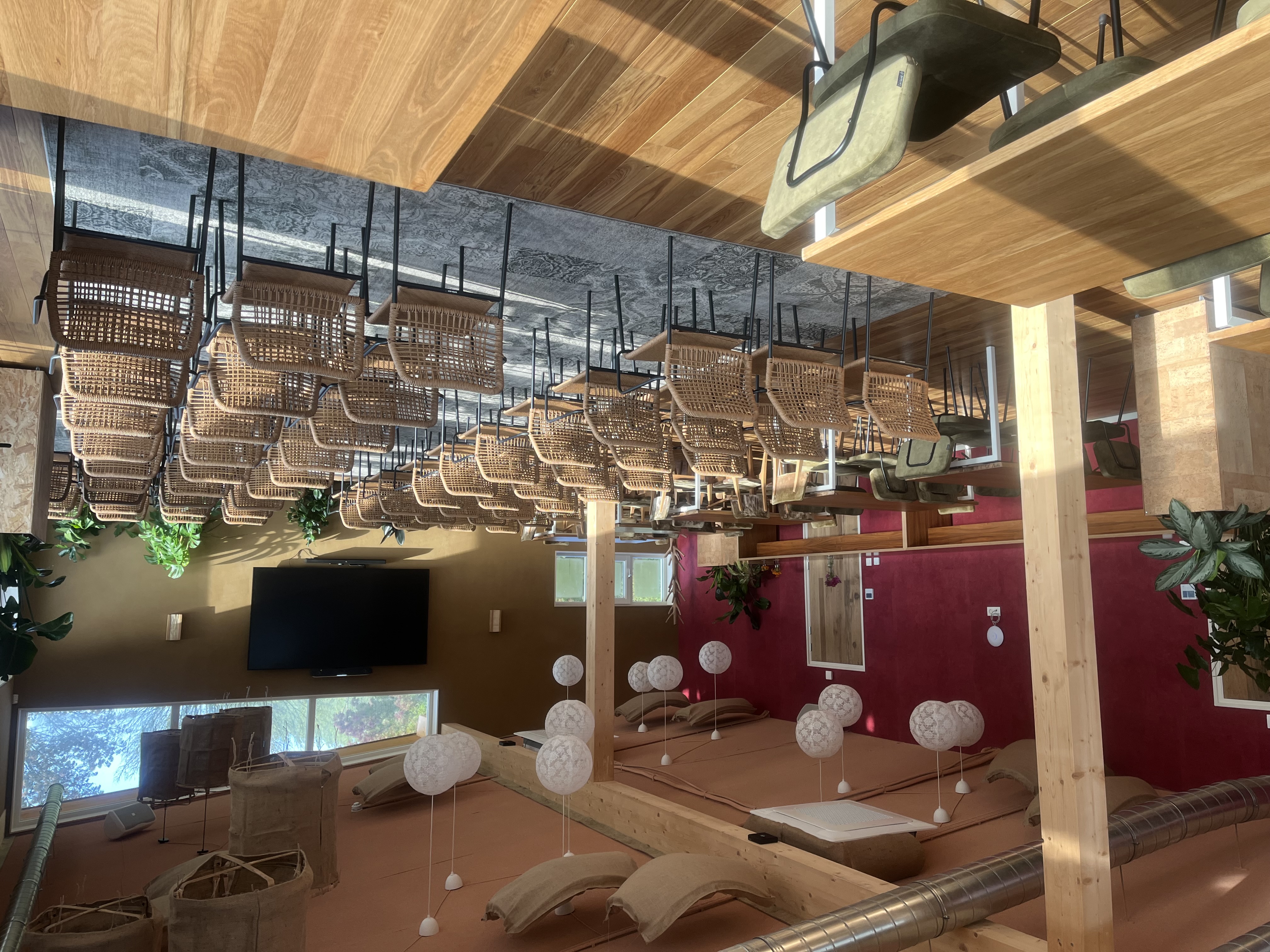 Een bijzondere vergaderruimte met een mos plafond en prachtig uitzicht op de natuur.